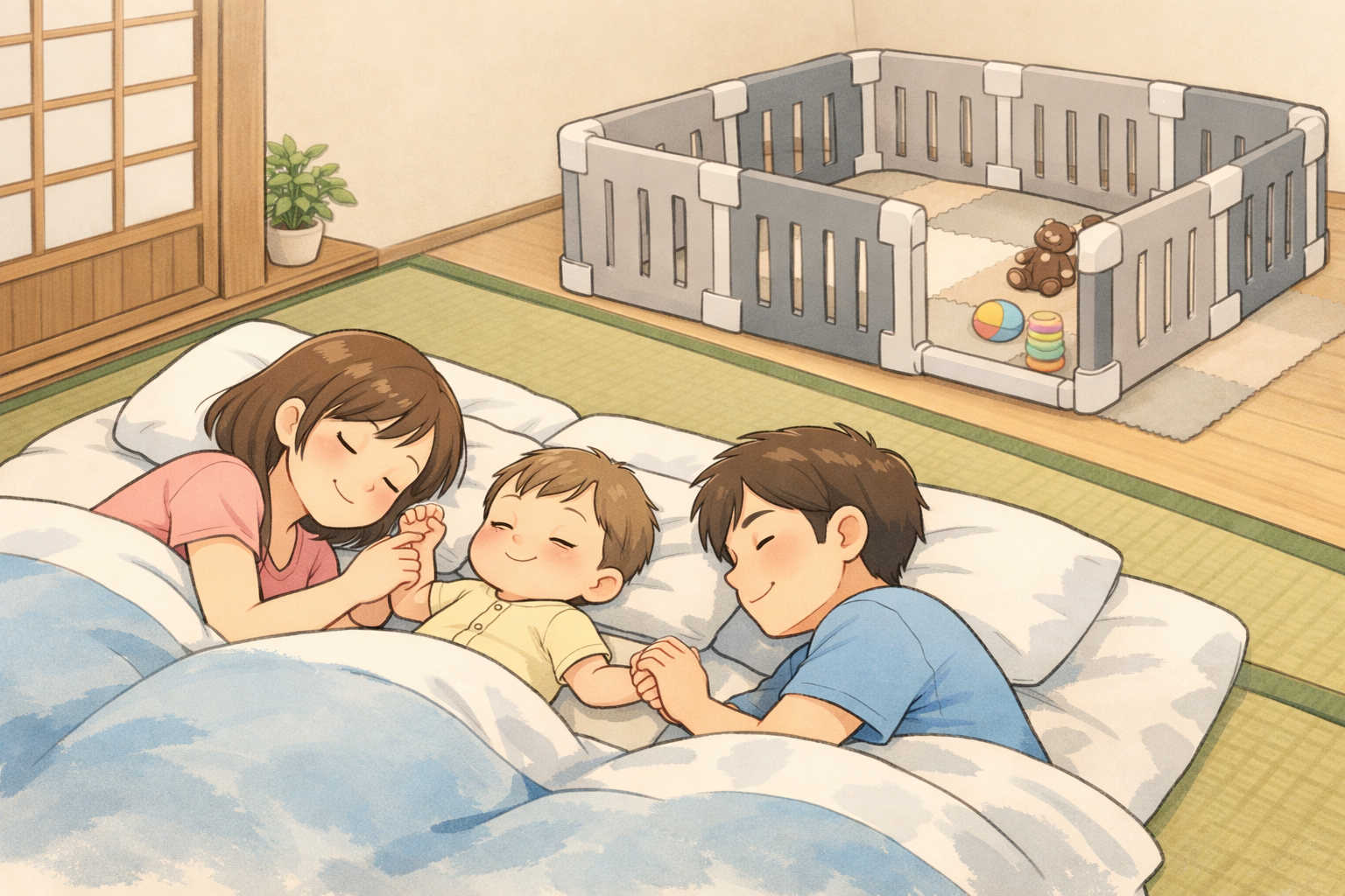 なぜかというと、ベビーベッドを卒業するにあたり、和室に布団を敷いて、親子3人で川の字で寝ることにしました。